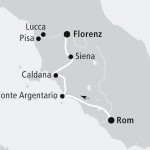 Die siebentägige Kombinationsreise „Aus der ewigen Stadt ins Tal der Zypressen“ startet in Rom und führt über Monte Argentiano und Caldana an der Küste bis nach Siena und Florenz. Die Reise enthält eine dreistündige Rom-Tour bei Nacht, eine Weinprobe auf dem Weinfeld des Montebelli Country Hotels in Caldana sowie für vier Tage einen Mietwagen inklusive ausführlichen Tipps und Beschreibungen für die vorgesehene Route. Übernachtet wird in komfortablen Hotels, mal mitten in der Stadt, mal in landschaftlich eindrucksvoller Kulisse.